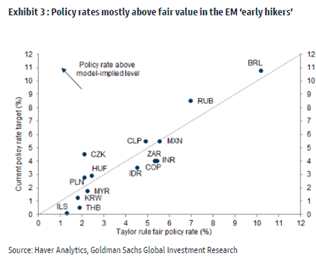 6. The fight against inflation, i.e. tightening of financial conditions has already occurred in some EMs. Many of the EMs with elevated inflationary pressure did not take the Fed and ECB’s ‘transitory’ line and have already been tightening throughout much of 2021 (e.g. Brazil, Russia, and the Czech Republic), often with hikes that have brought policy rates to levels in line with an orthodox Taylor Rule approach. The ‘long and variable lags’ of these 2021 monetary tightening decisions are likely to weigh on EM inflation relative to DM economies, where policymakers are only just now beginning their tightening pivot from levels that are historically diverged from the past rule-based approaches.