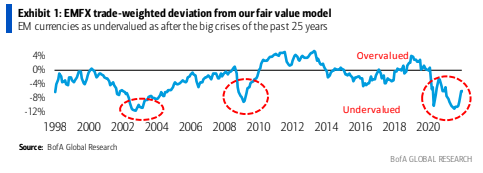 The elevated levels of real carry yield differentials are at EMFX REER valuation levels that are near twenty-five-year lows (per BofA) and EM equity markets are also priced at a discount to global markets.