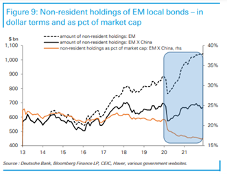 Per the below charts, a similar set-up can be seen in local currency bond markets (particularly for EM ex-China), where non-resident holdings as a share of outstanding bonds are approaching decade lows.