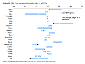 9. A related bullish factor for EMs is the lack of foreign inflows over the last two years, resulting in near trough foreign positionings in many EMs and across EM asset classes. The light positioning is illustrated in the below charts from DB, MS, and BofA. In EM equities, global fund managers are near record UW EM equities relative to their benchmarks (per MS), while a January 2022 BofA Global Fund Manager Survey found a nearly -1 st deviation underweight relative to historical norms.